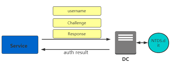 第四步:服务将Response、用户名、Challenge发送给域控验证。域控使用本地数据库(NTDS.dit)中保存的对应用户的NTLM hash对Challenge进行加密,得到的结果与Response进行对比,一致则认证成功。然后将认证结果返回给服务端。