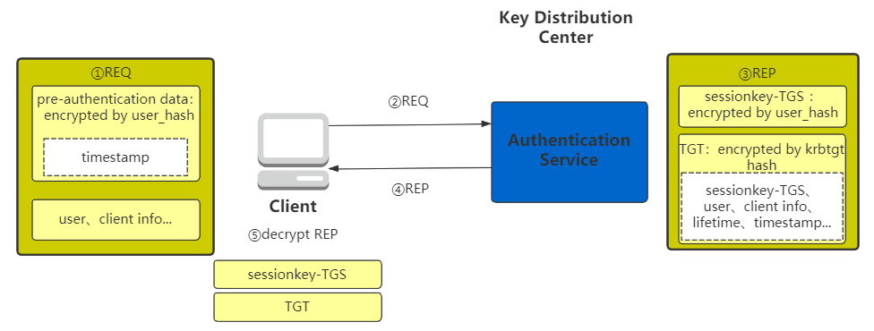 生成session key以及TGT:域控中存储了域中所有用户密码hash(user_hash),KDC的AS依据用户名查找相应的user_hash,成功解密预认证信息,验证客户端通过,然后会生成一个sessionkey-TGS(后续用于加密Client与TGS通信),以及TGT(由krbtgt hash加密的sessionkey-TGS、user、client info、lifetime、timestamp等信息)。