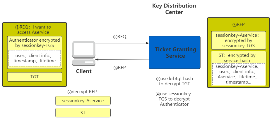 生成session key以及ST:TGS收到请求,利用krbtgt hash解密TGT,获取到sessionkey-TGS,user、client info等信息,然后利用sessionkey-TGS解密验证器,校验验证器和TGT中的user信息,如果一致,则说明该请求符合TGT中声明的用户,该用户是通过AS认证的。然后TGS会为用户user和服务Aservice之间生成新的session key sessionkey-Aservice,并用sessionkey-TGS加密sessionkey-Aservice。再生成一个ST,内容包含user、client info、lifetime、timestamp、sessionkey-Aservice,ST用Aservice的service_hash加密。