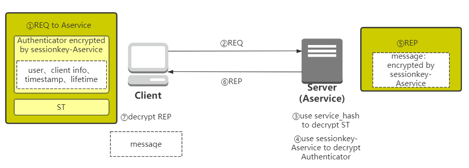 通过第二步,Client获取到sessionkey-Aservice以及ST,接下来Client利用sessionkey-Aservice加密Authenticator,连同ST去请求Server的Aservice。Aservice 利用自己的service_hash解密ST,获得sessionkey-Aservice,再解密Authenticator验证Client声明的user信息,通过认证后Aservice还需要用sessionkey-Aservice加密一段信息返回给Client,Client利用sessionkey-Aservice解密成功说明Aservice用自己service_hash成功解密出了sessionkey-Aservice,是可信服务端。