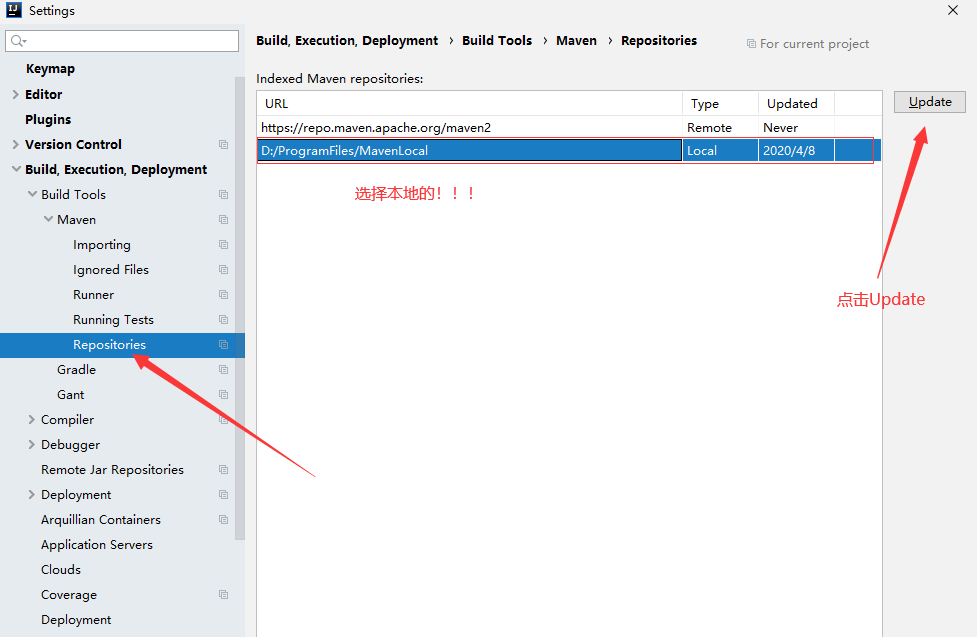 File—>Settings—>Build,Execution,Deployment—>Build Tools—>Maven—>Repositories
