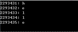 #include <stdio.h> const int N=5; int main() { char a[5] = {'h','e','l','l','o'}; int i; for(i=0; i<N; i++) printf("%d: %c\n", &a[i], a[i]); return 0; }