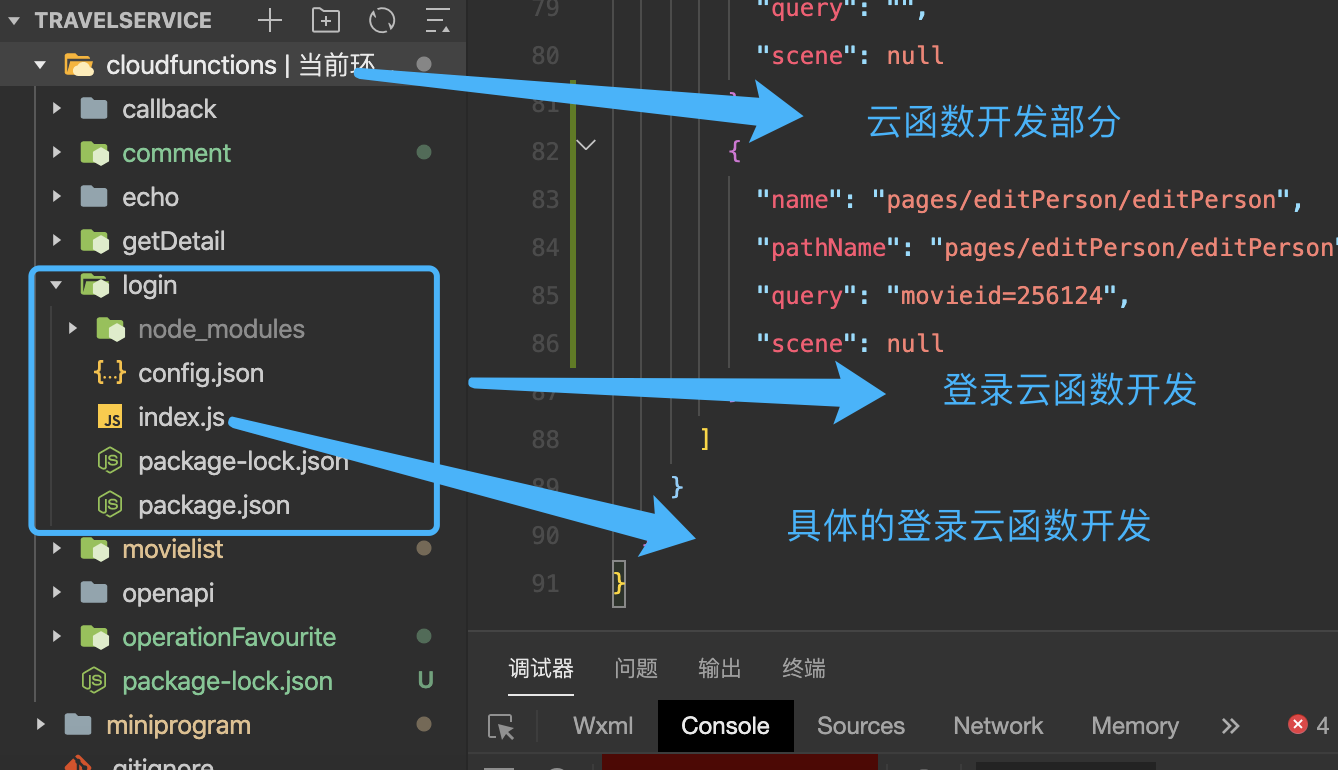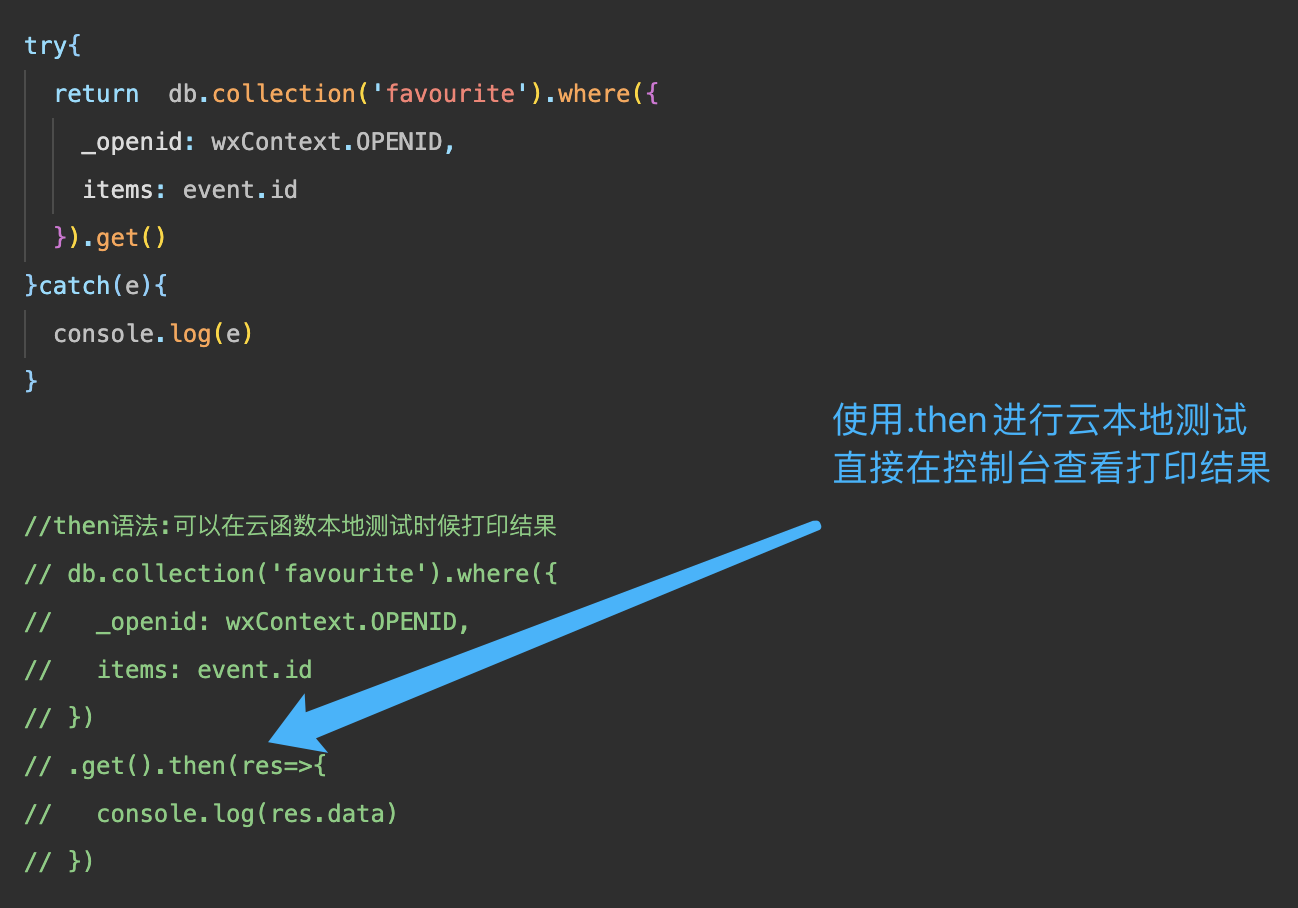 云函数开发部分,多使用云函数本地测试,本地测试不支持异步所以await关键字要先去掉才能测试,控制端打印可以直接打印对象,不用像👆的打印方式
