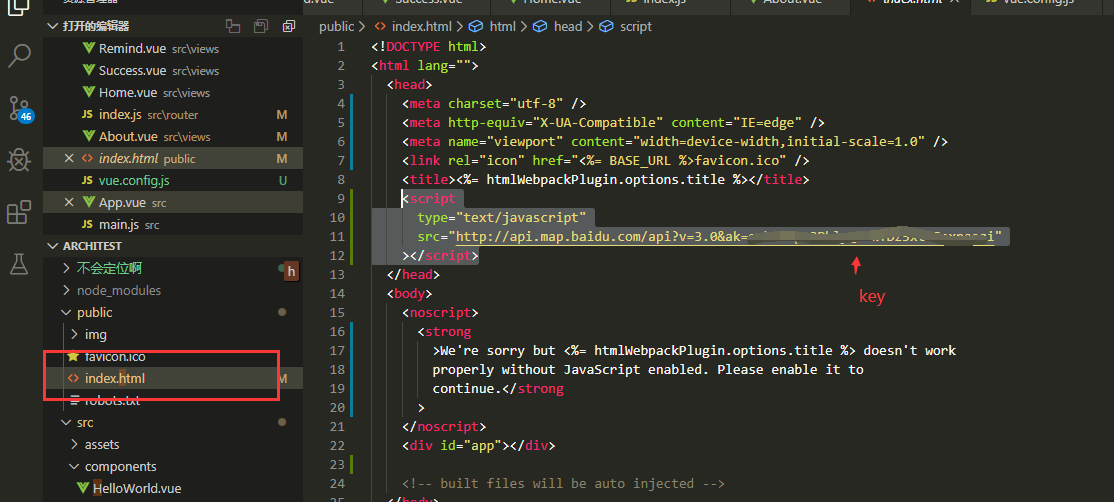 第二步引入CDN,由于使用了Vue的脚手架,提供一个index.html的入口文件,把引入写在