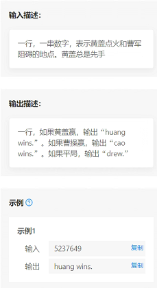前方的斥候给孙刘大军带回来一封密函交给诸葛先生,这封密函是一-串数字代表黄将军和曹操对弃的顺序,现在让诸葛先生你来判断这场战斗究竟是谁赢了