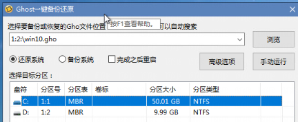 7.点击PE桌面里"Ghost备份还原" 开始还原ghost系统,点击浏览按钮选中win10.gho,点击还原系统,选中C盘。