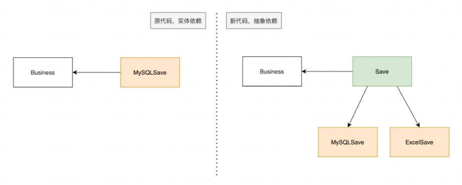 实体 Business 依赖抽象有一个好处:抽象稳定。相对于多变的实体来说,抽象更稳定。代码改动前后的依赖关系发生了重大变化,之前调用方 Business 直接依赖于实体 MySQLSave,通过依赖倒置改造后 Busines 和 ExcelSave、 MySQLSave 全都依赖抽象。