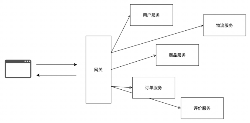 微服务架构的关键字是拆,将原本糅合在一个应用中的多个功能拆成多个小应用,这些小应用串联起来组成一个与之前单体架构功能相同的完整应用。具体示意如下: