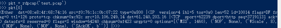 这行代码将test.pcap文件一次性读入内存,pkt中是很多个数据包。pkt可以当做列表顺序访问。