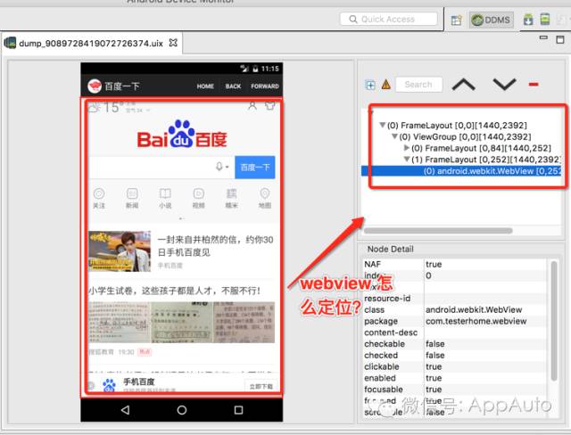 如下图,Hybrid APP有webview,在定位webview element的时候,如果使用的是DDMS,会发现压根儿都找不到相关的elements而只能找到一个webview控件。