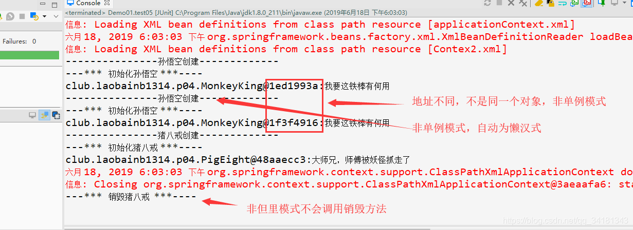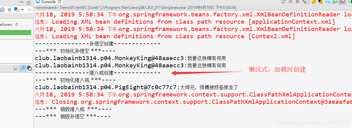 前面的案例都是启加载方式,启动Spring容器时创建对象,所以是饿汉式的单例模式,接下来我们通过修改bean的属性来修改为懒加载,非单例,并比较他们的初始化以及销毁时机。