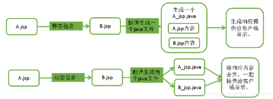 @include指令是“静态包含”,即在翻译期间,把包含的页面也翻译发哦当前页面的java文件中,也就是java源文件合并,这种特性允许重复使用部分页面,比如标题,导航栏,页眉页脚等