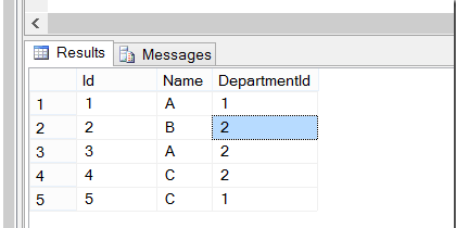 Name,DepartmentId,ROW_NUMBER() over(partition by name order by departmentid) row