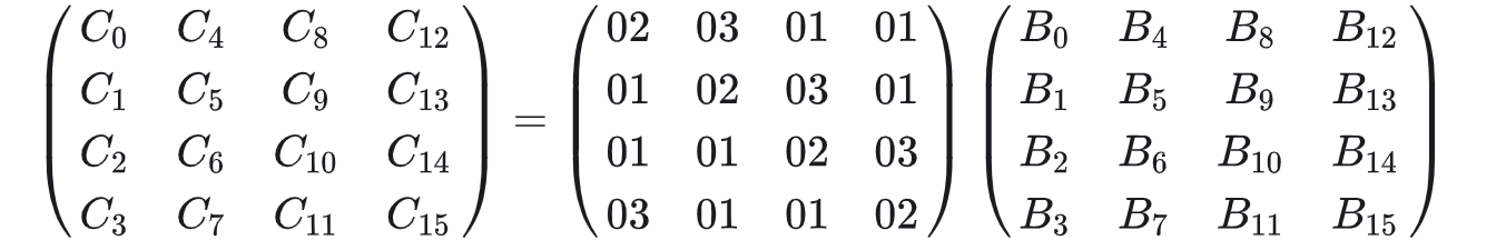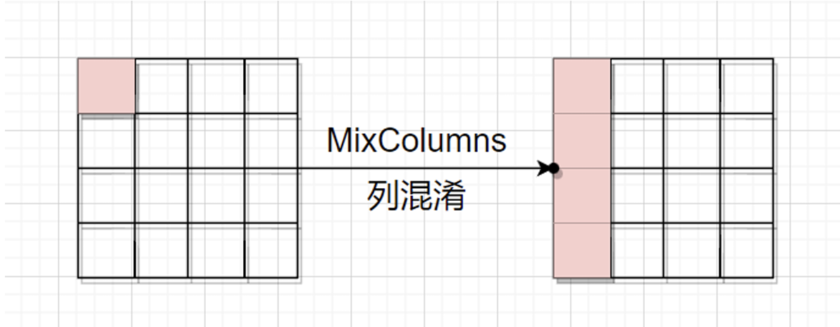 利用有限域上的线性变换,将每一列的字节混合,使得每个输出字节都受到一列中所有输入字节的影响。