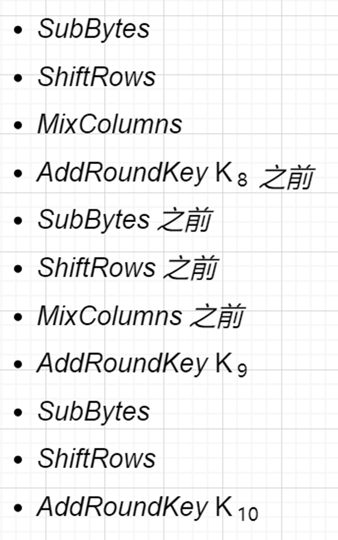 第十轮中,包含三个步骤:字节替换,行移位,轮密钥加。相比前九轮缺一个列混淆,其余相同。