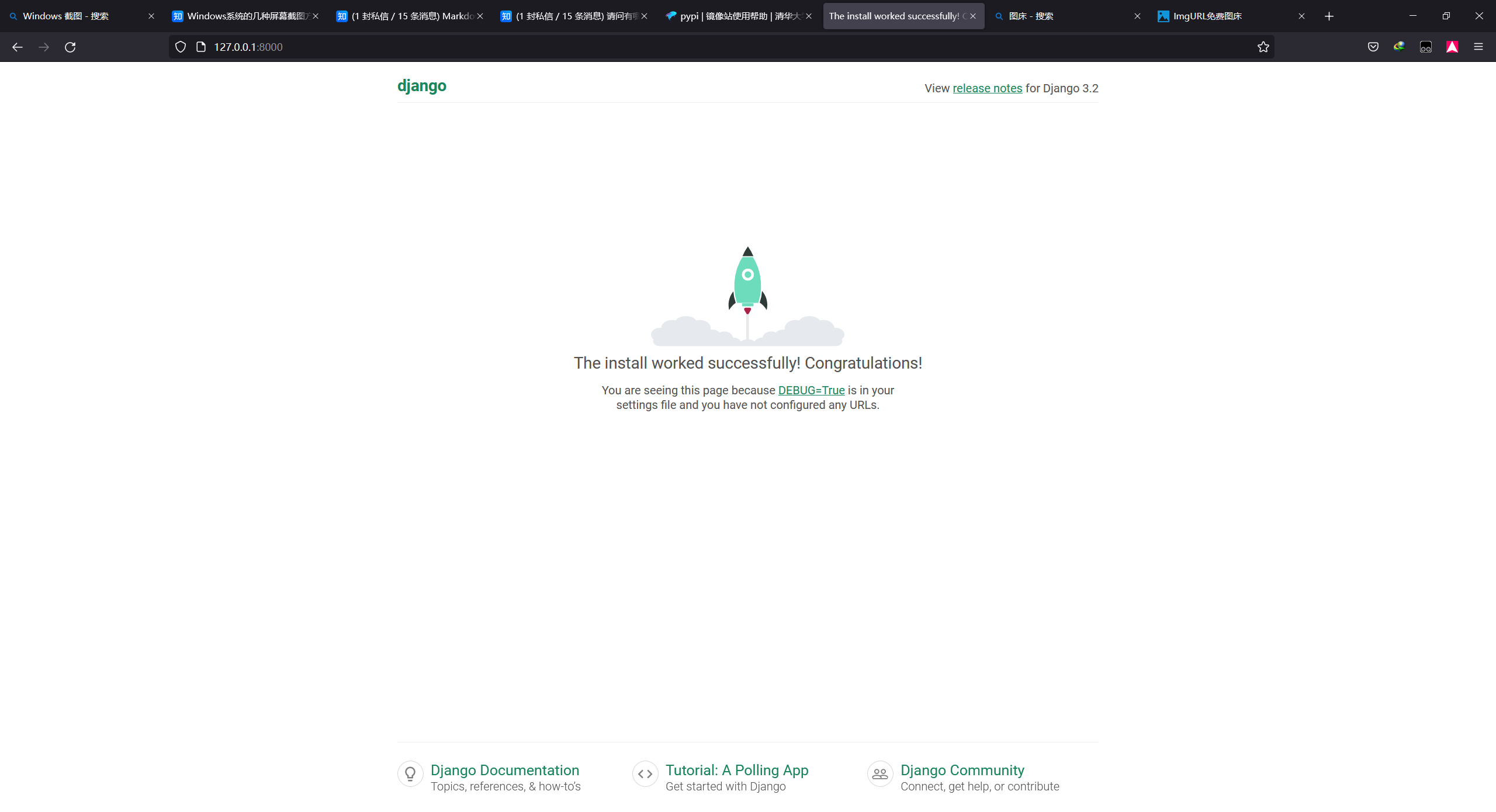 在输出一大堆东西的情况下,我们打开浏览器,访问 127.0.0.1:8000:
