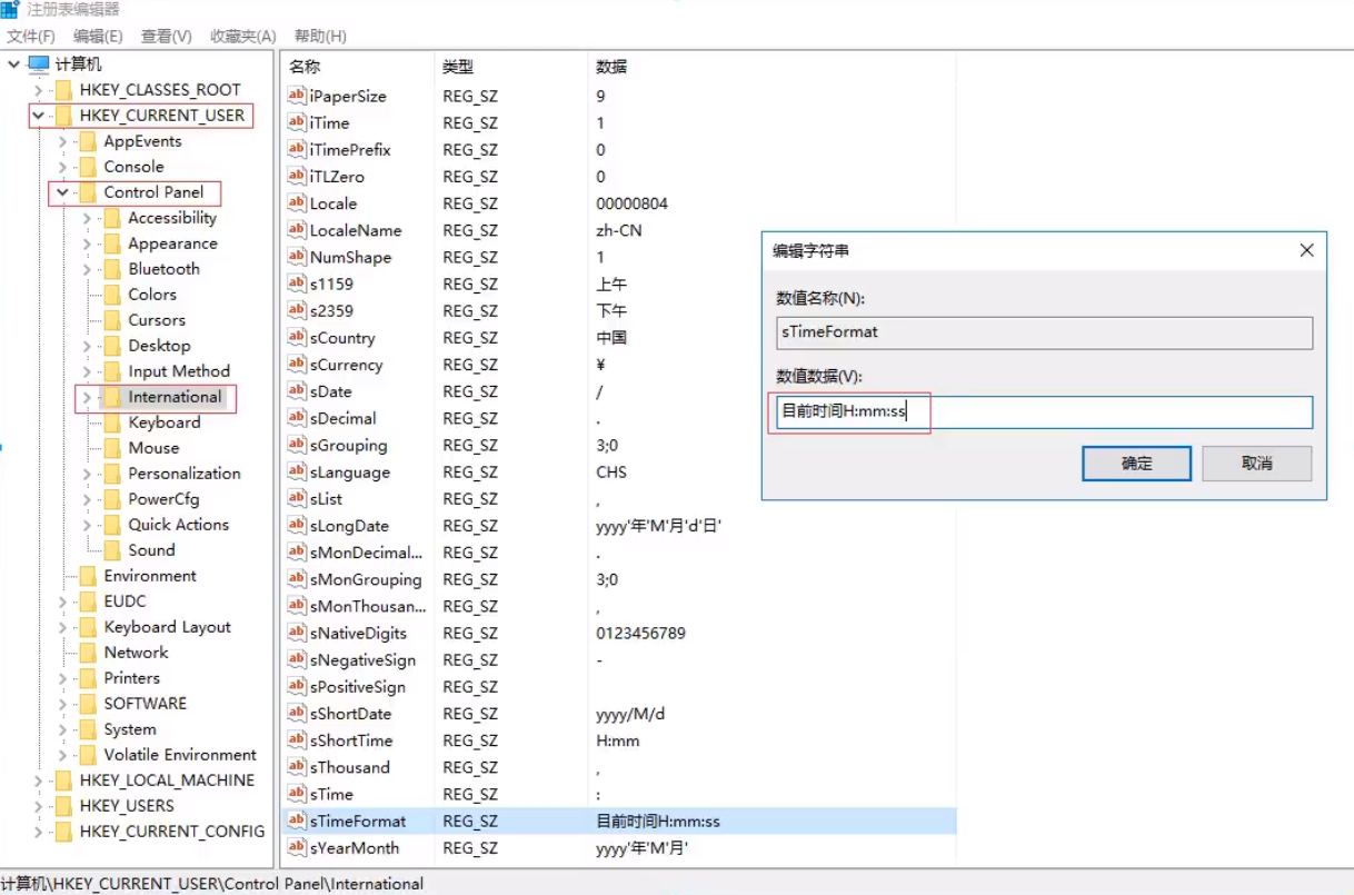 打开注册表编辑器,锁定"HKEY_CURRENT_USER\Control Panel\lnternational”下的值sTimeFormat 进行修改