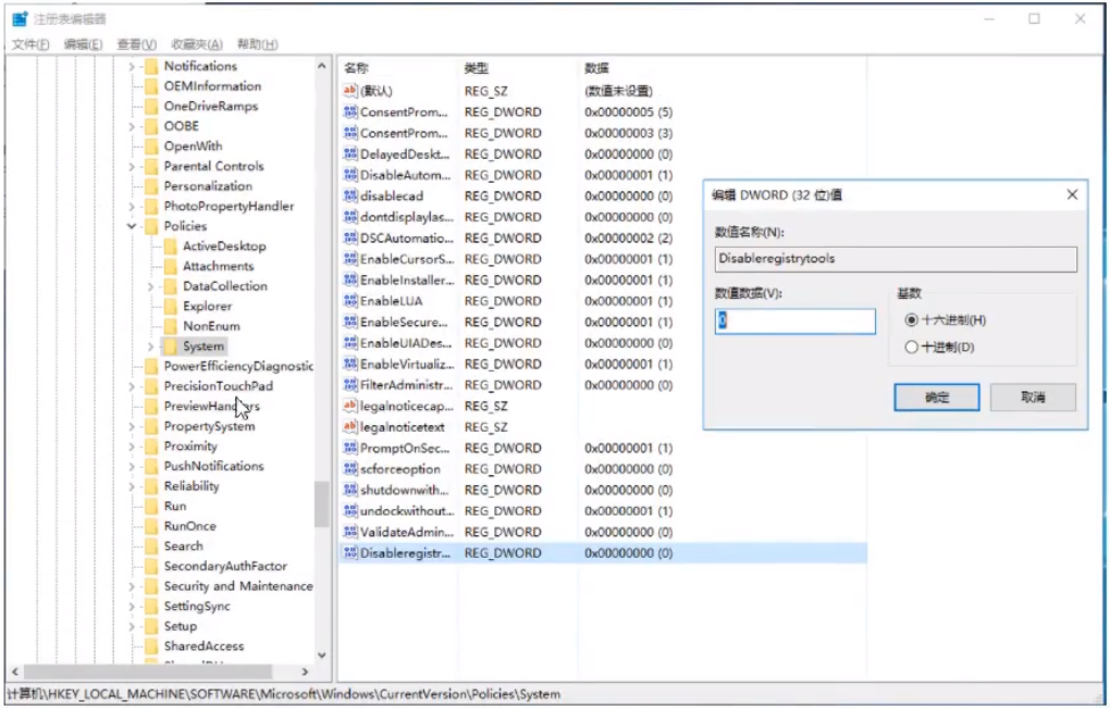 当注册表被锁定后,Windows自带的注册表编辑器就无法打开,需要使用外部第三方注册表编辑工具来进行打开,找到对应项,修改值为0