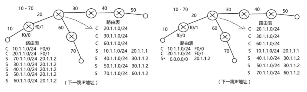 使用场景:一般应用于末节(末梢)网络(网络的最末端)(路由器的一端只连接了一个网络)