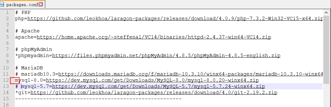 12行的#去掉 其中 配置的mysql的版本号可以直接替换想要的版本 例如 一开始是 mysql-8.0.13 我现在改的是mysql-8.0.20 保存并退出