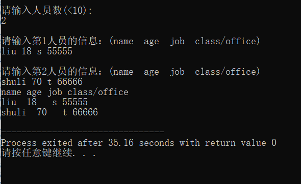 5、 调试程序:设有一个教师与学生通用的表格,教师的数据有姓名、年龄、职业、教研室四项,学生有姓名、年龄、专业、班级四项,编程输入人员的数据,再以表格输出。