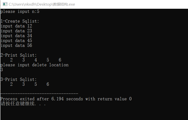 顺序存储结构需要平均移动表长一半的元素,时间复杂度:O(n),输入线性表的元素个数,然后构建一个新的线性表;连续用ListDelete_sq函数删除元素,将其元素输出;在下一步中输入删除元素的位置,输出运行后的线性表。