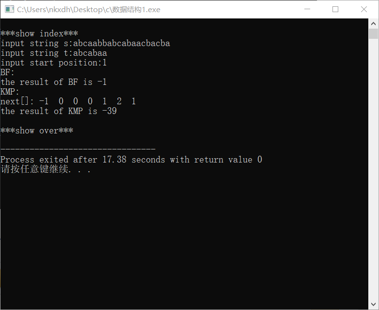 printf("the result of KMP is %d\n",index_kmp(&s,&t,k,next));