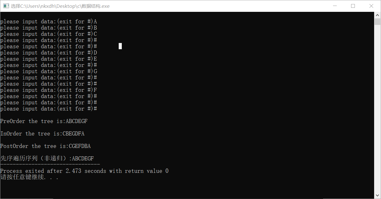 2、在上题中补充求二叉树中求结点总数算法(提示:可在某种遍历过程中统计遍历的结点数),并在主函数中补充相应的调用验证正确性。