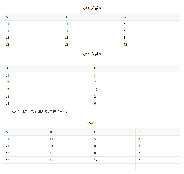 (3)自然连接:自然连接是一种特殊的等值连接,他要求两个关系表中进行连接的必须是相同的属性列(名字相同),无须添加连接条件,并且在结果中消除重复的属性列。
