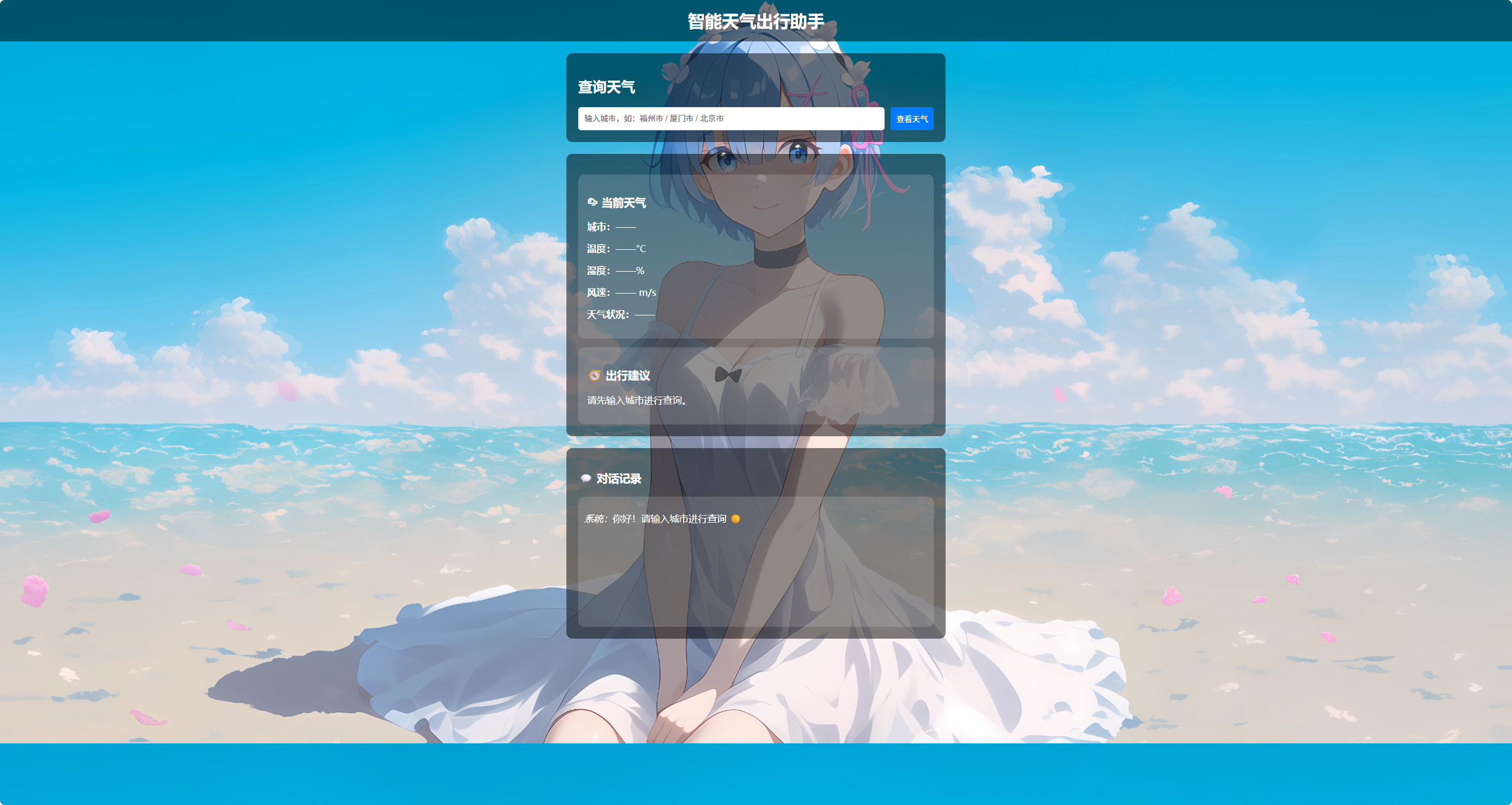 前端使用 HTML + JavaScript 实现天气查询与结果展示。用户可输入城市名称,系统自动显示温度、湿度、风速及天气状况,并附带出行建议。
