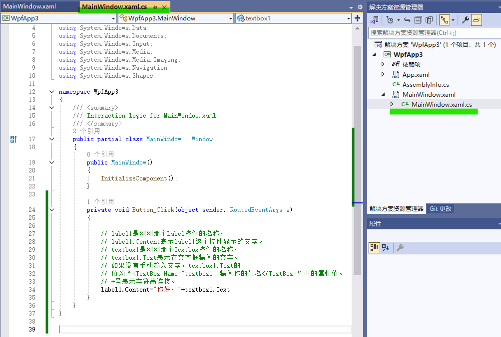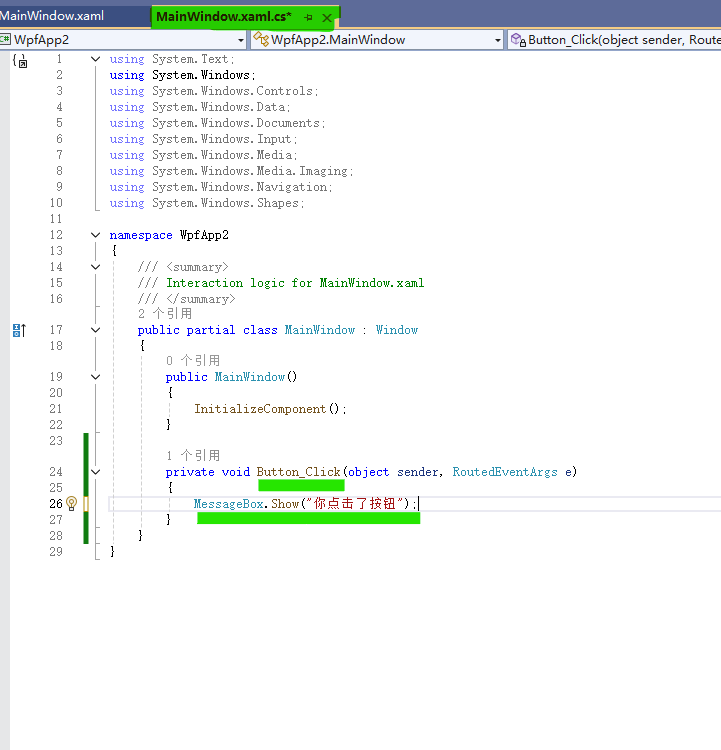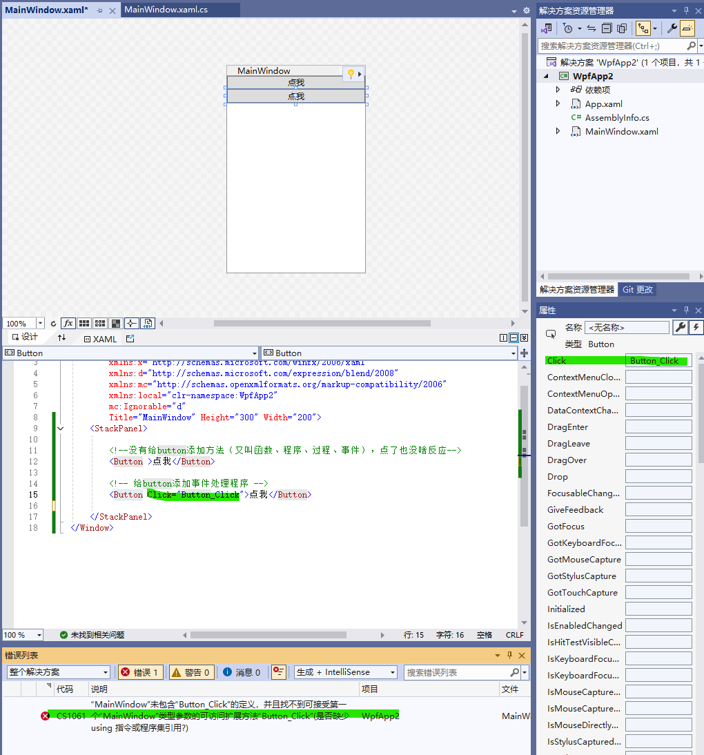 给button添加了方法button_click,当然现在是CS文件中有可能没有声明方法,按F5了会提示错误。如果没有出现错误提示说明VS已经自动生成了button_click方法。