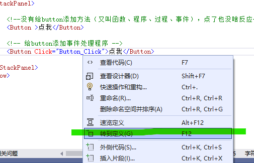 可以在XAML中点击button_click右键,点击转到定义,也会生成自动生成方法。