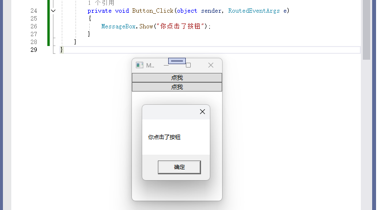 很简单吧?当然,上面的按钮并没有任何实际的逻辑在里面。不过,如果你把鼠标移上去,就能发现它周围一圈还是有一个不错的悬浮效果的。下面就给它加点事件逻辑进去,订阅它的Click事件: