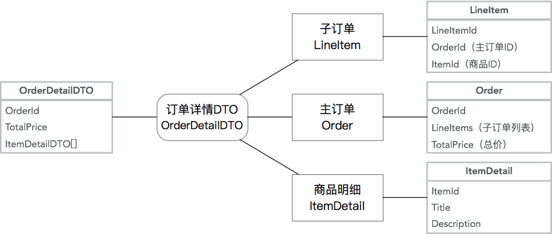 合并多个Entity为一个DTO:这种情况通常为了降低网络传输成本,降低服务端请求次数,将多个Entity、DP等对象合并序列化,并且让DTO可以嵌套其他DTO。同样常见的案例是在订单详情里需要展示商品信息: