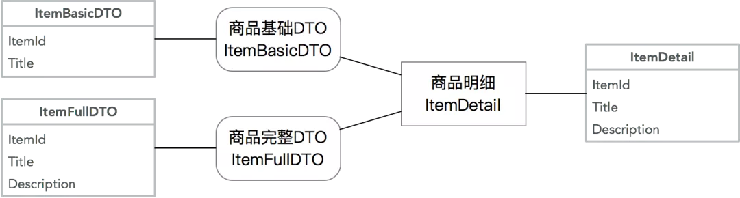 从复杂Entity里抽取部分信息形成多个DTO:这种情况通常在Entity复杂,但是调用方只需要部分核心信息的情况下,通过一个小的DTO降低信息传输成本。同样拿商品模型举例,基础DTO可能出现在商品列表里,这个时候不需要复杂详情: