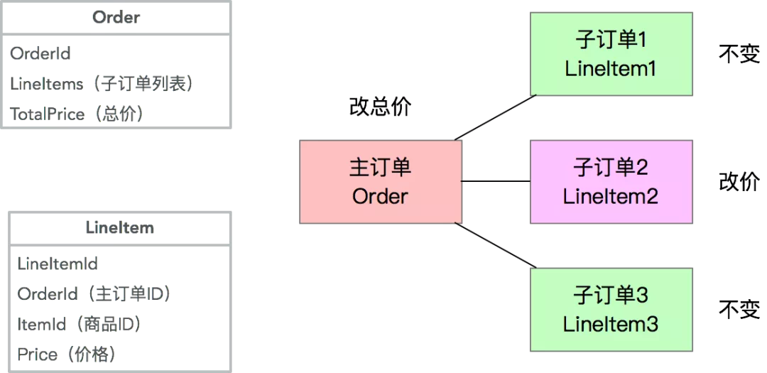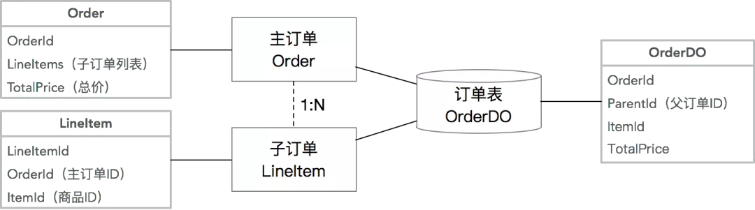 多个关联的Entity合并一张数据库表:这种情况通常出现在拥有复杂的Aggregate Root - Entity关系的情况下,且需要分库分表,为了避免多次查询和分库分表带来的不一致性,牺牲了单表的简洁性,提升查询和插入性能。常见的案例如主子订单模型: