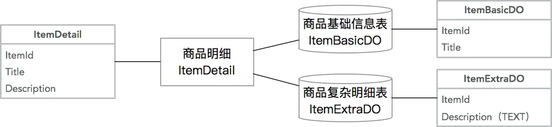 在实际开发中DO、Entity和DTO不一定是1:1:1的关系。一些常见的非1:1关系如下:复杂的Entity拆分多张数据库表:常见的原因在于字段过多,导致查询性能降低,需要将非检索、大字段等单独存为一张表,提升基础信息表的检索效率。常见的案例如商品模型,将商品详细描述等大字段单独保存,提升查询性能: