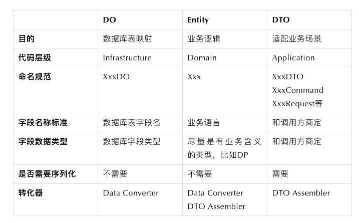 - Data Object (DO、数据对象):实际上是我们在日常工作中最常见的数据模型。但是在DDD的规范里,DO应该仅仅作为数据库物理表格的映射,不能参与到业务逻辑中。为了简单明了,DO的字段类型和名称应该和数据库物理表格的字段类型和名称一一对应,这样我们不需要去跑到数据库上去查一个字段的类型和名称。(当然,实际上也没必要一摸一样,只要你在Mapper那一层做到字段映射)