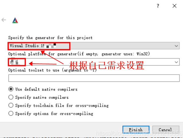 配置 Visual Studio 编译器,平台版本。根据自己需要配置 ,最后点击 Finish;