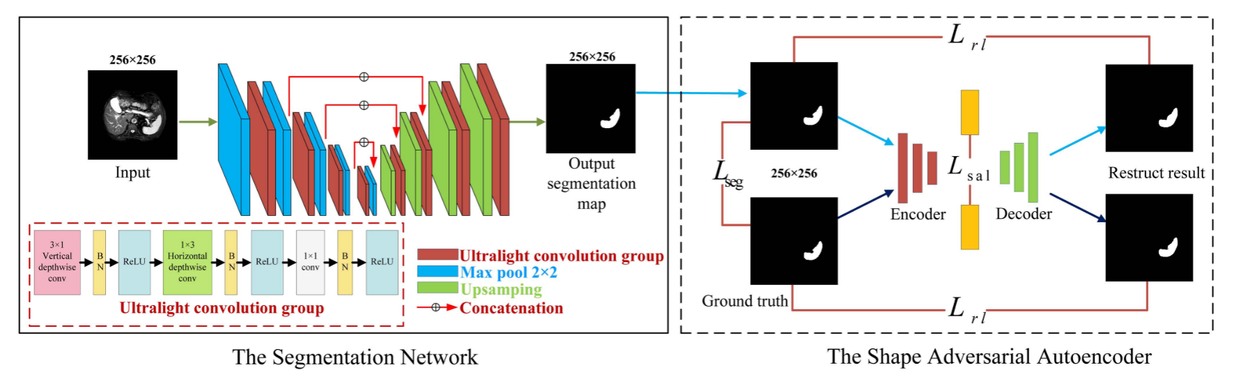 卷积神经网络在医学图像分割中取得了显著的成功。然而,它们也受到需要大量参数的影响,导致难以将CNN部署到低源硬件,例如,嵌入式系统和移动的设备。虽然已经报道了一些压缩的或小的存储量的模型,但是它们中的大多数可能导致分割精度的降低。为了解决这个问题,提出一种形状引导超轻网络(SGU-Net),它具有极低的计算成本。SGU-Net的贡献主要包括:首先,提出了一种能够同时实现双重可分离卷积的超轻卷积,即不对称卷积和深度可分离卷积。提出的超轻卷积不仅有效地减少了参数数目,而且增强了SGU-Net的鲁棒性。其次,SGU-Net采用了一个额外的对抗性形状约束,让网络学习目标的形状表示,这可以显著提高腹部医学图像的分割精度。实验结果表明,SGU-Net以较低的存储开销获得了较高的分割精度,优于现有网络。此外,将超轻卷积应用到三维体积分割网络中,以更少的参数和内存使用获得了相当的性能。图1展示了SGU-Net的整体架构。SGU-Net包含两个部分的网络,左边是分割网络,右边是形状对抗自编码器网络。在分割网络中,本文提出了一种超轻卷积,将标准卷积分解为点卷积和深度非对称卷积,这不仅有效减少了参数量,还可以增加模型的鲁棒性。在形状约束对抗自编码器网络中设计了一种新的对抗性约束策略来引导网络分割,以确保充分利用器官形状和位置固定的先验知识。