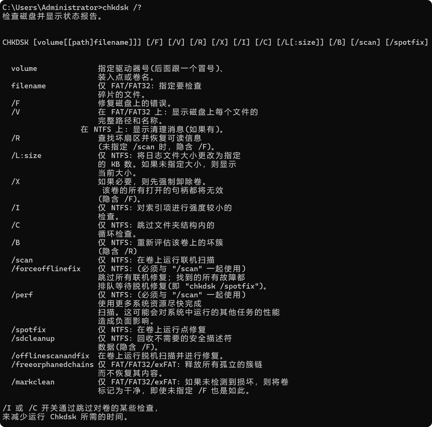 CHKDSK /offlinescanandfix 在卷上运行脱机扫描并进行修复。