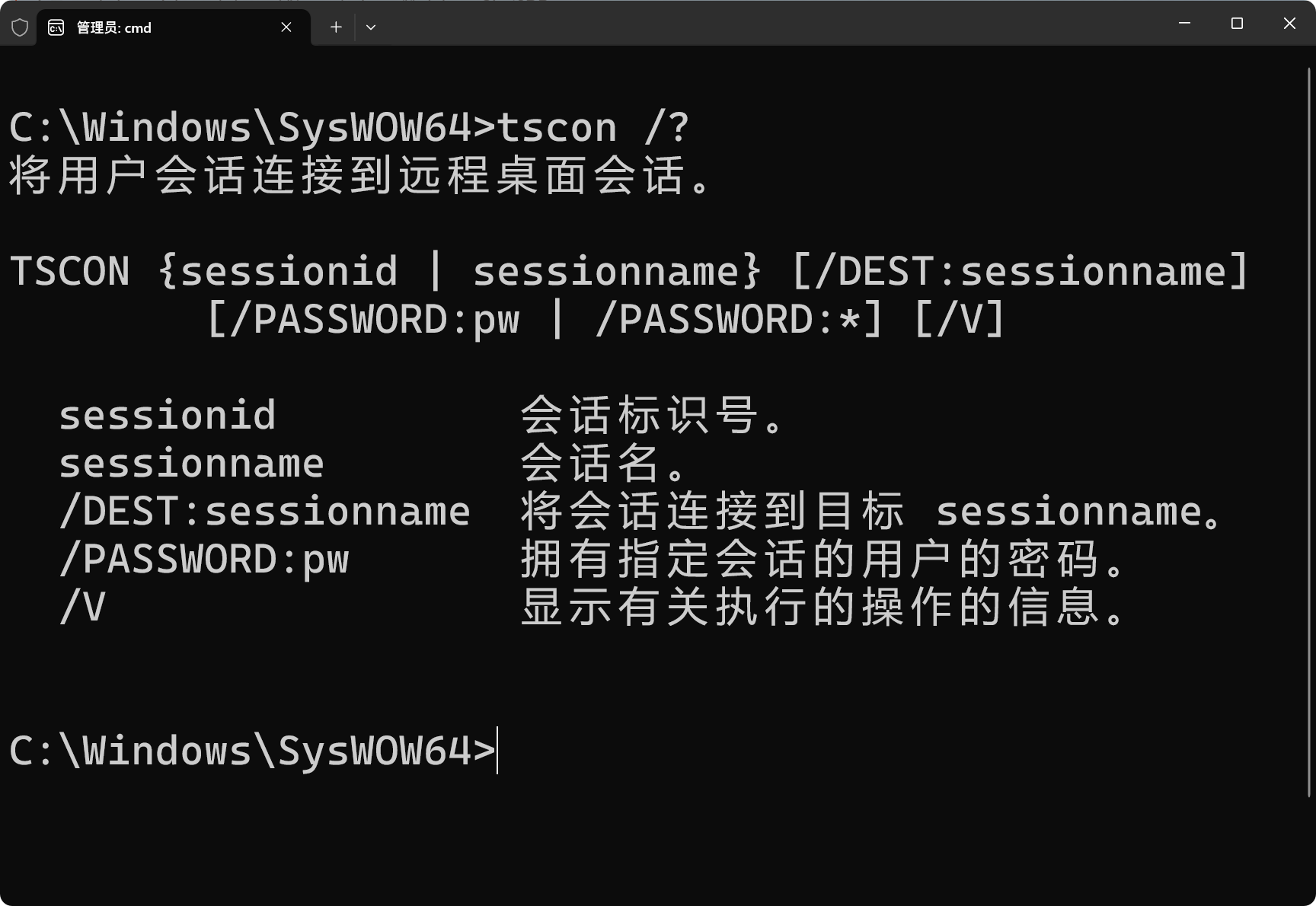 tscon命令的帮助信息,包括所有可用参数和使用方法,适用于用户不熟悉命令时查询。