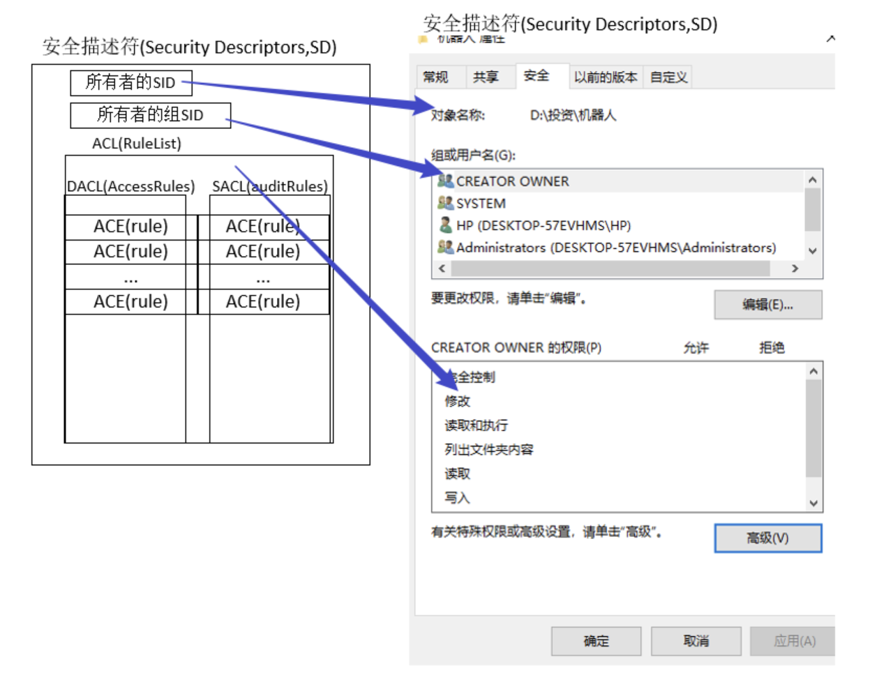 在 Windows 操作系统中,安全描述符(Security Descriptor,简称SD)是用来定义对象的安全性设置的结构体,包含了对象的安全信息。这些对象可以是文件、目录、注册表项、进程或线程等。而访问控制列表(Access Control List,简称ACL)是安全描述符中的一个重要部分,用于指定对某个对象的访问权限。