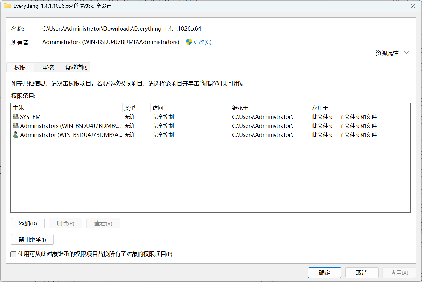 - 功能:Windows 允许资源的权限继承,从父对象继承到子对象。这种机制通常用于文件夹和文件系统的访问控制。继承可以确保一致性,简化权限管理。
