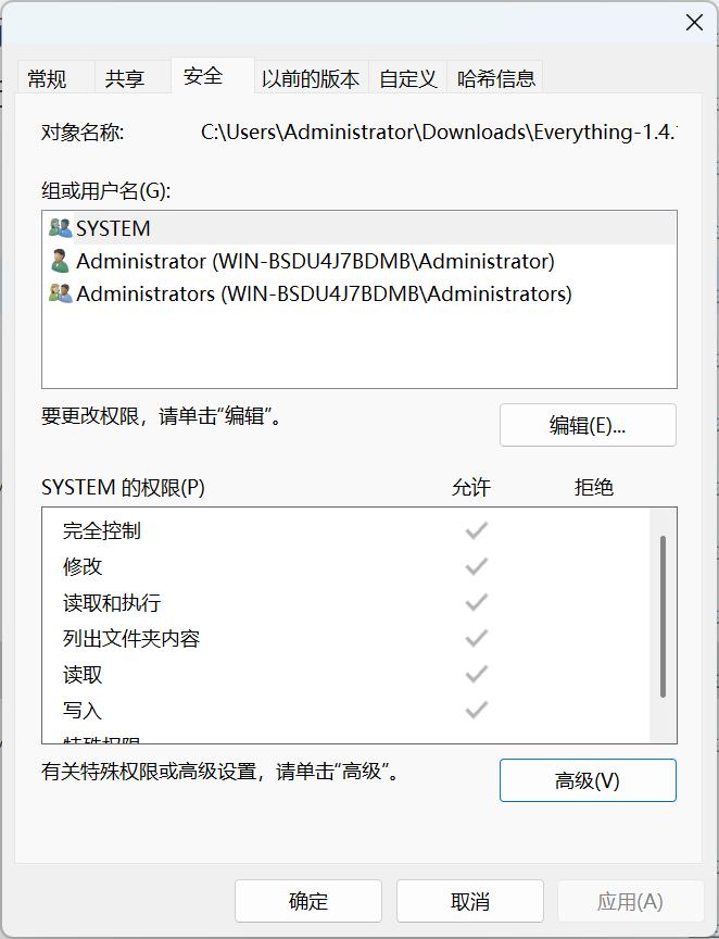 当你右键点击文件或文件夹,选择“属性”并进入“安全”选项卡时,你正在查看该对象的安全描述符。它显示了 DACL(针对不同用户的权限)以及文件的其他安全信息。