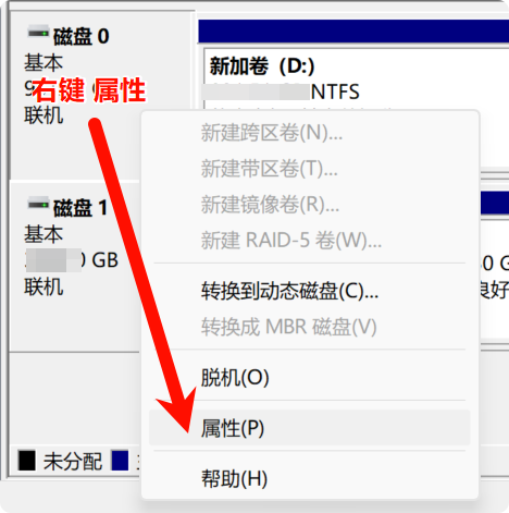Win + X,然后选择 磁盘管理(Disk Management)。 - 在磁盘管理界面中,右键点击磁盘(如磁盘 0、磁盘 1 等)并选择 属性。