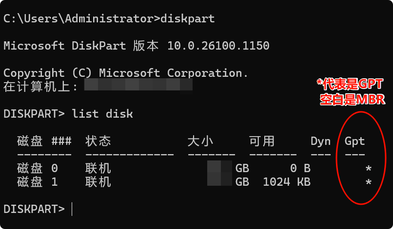 这个命令将列出所有磁盘的分区表类型,如果是 GPT,则显示为 GPT,如果是 MBR,则显示为 MBR。